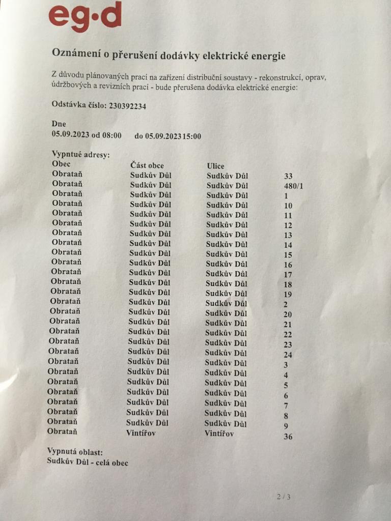 Vážení občané, z důvodu plánovaných prací na zařízení distribuční soustavy bude přerušena dodávka elektrické energie: 5.9.2023 od 8:00 do 15:00 hodin v místní části Sudkův Důl - celá obec