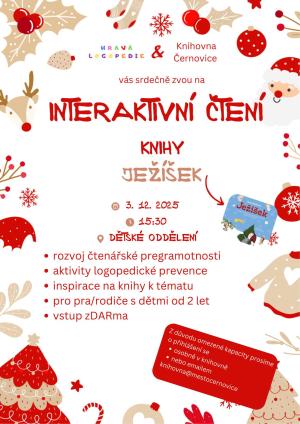 Zveme Vás na zimní interaktivní čtení do Dětské knihovny v Černovicích, které proběhne 3.12. od 15:30.Těšit se můžete na příběh z knihy "Ježíšek" a další aktivity. Prosíme o nahlášení účasti na knihovna@mestocernovice.cz nebo osobně v knihovně. Těšíme se na vás!