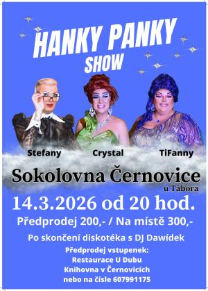 V sobotu 14.3.2026 uvidíte v černovické Sokolovně travesti Hanky panky show. Po představení bude následovat diskotéka. Vstupenky jsou k prodeji v Městské knihovně a v restauraci U Dubu.