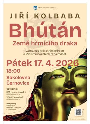 V pátek 17.4.2026 od 18 hodin se můžete těšit na další setkání s cestovatelem Jiřím Kolbabou, tentokrát nám představí Bhútán-Země hřmícího draka. Vstupenky jsou k prodeji v Městské knihovně, v cukrárně U Koblížků a na SMSTicket. Občerstvení je zajištěno