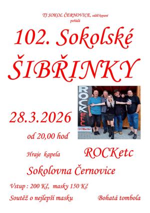 V sobotu 28.3.2026 od 20 hodin se na Sokolovně konají již 102. Sokolské Šibřinky. K tanci a poslechu hraje kapela ROCKetc