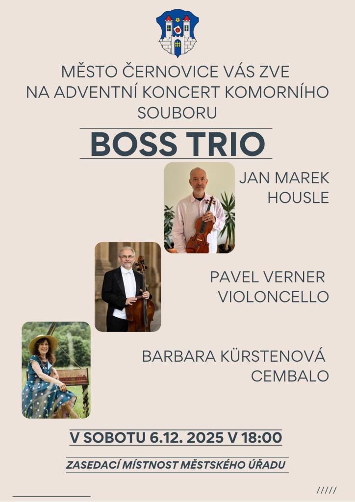 V sobotu 6.12.25 od 17:30 bude v zasedací místnosti MěÚ zahájena výstava obrazů Viléma Kodíčka a od 18 hodin bude následovat koncert vážné hudby v podání komorního souboru Boss Trio. Vstupné dobrovolné.